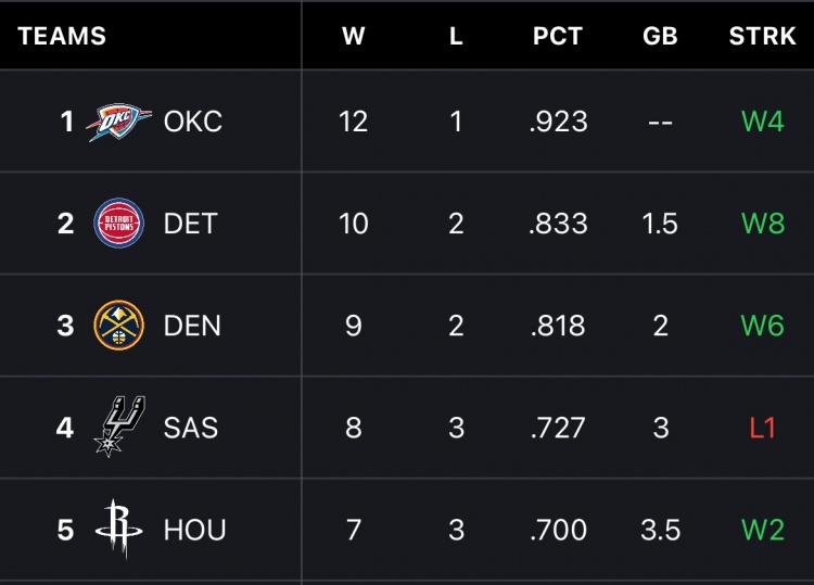 仅一支东部球队!目前联盟战绩前五:雷霆/活塞/掘金/马刺/火箭