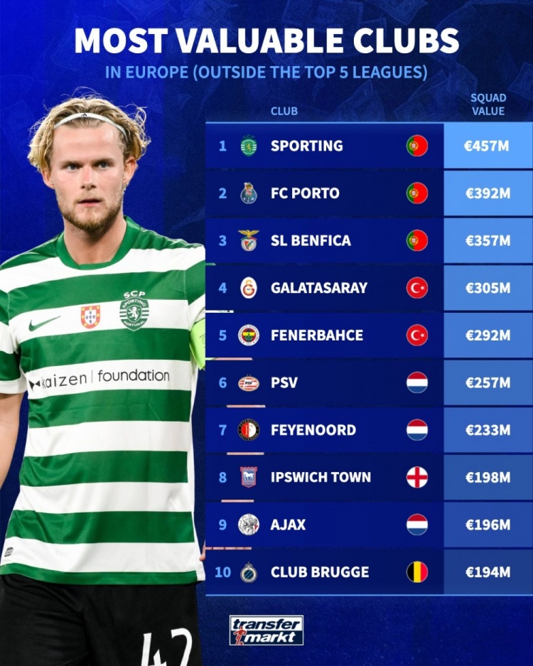 2025-11-12 00:01:25欧洲非五大联赛球队身价排名:葡超土超荷甲霸榜,英冠伊镇在列