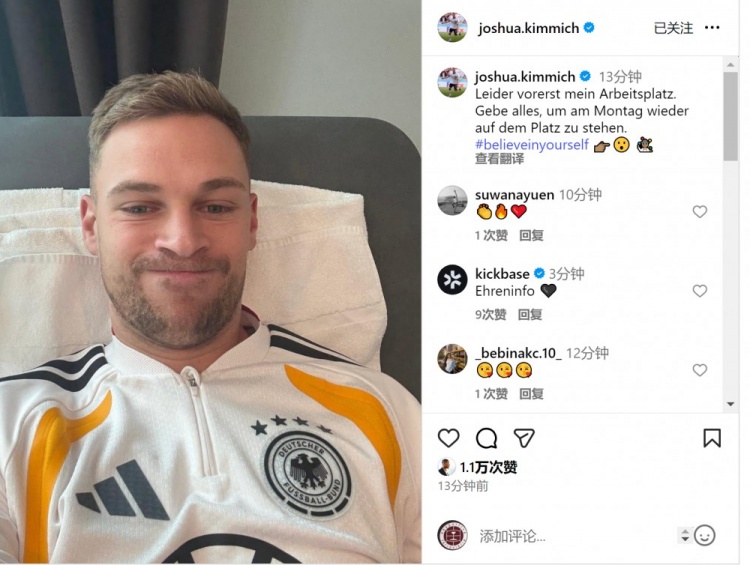 基米希社媒晒出自己在医疗室的照片,并写道:“遗憾的是这里暂时成为了我的工作场所,我会竭尽全力,争取在下周一(对阵斯洛伐克)重返赛场。”